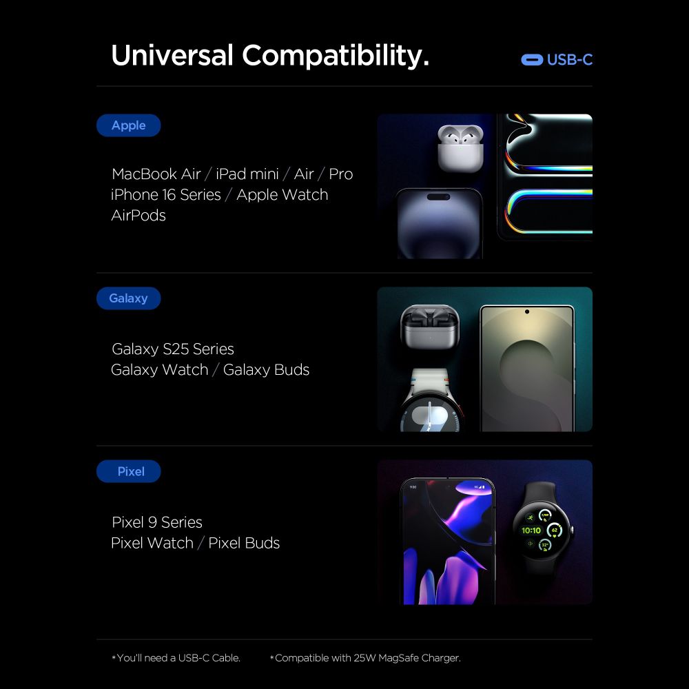 Διαθέτει 3 θύρες φόρτισης (2 USB-C και 1 USB-A), επιτρέποντας την ταυτόχρονη φόρτιση smartphone, tablet, laptop και άλλων συμβατών συσκευών.